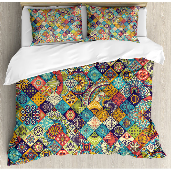 Bohemian Checkered Pattern With Ethnic Ornamental Floral Figures Indian Folk Art Abstract Duvet Cover Set